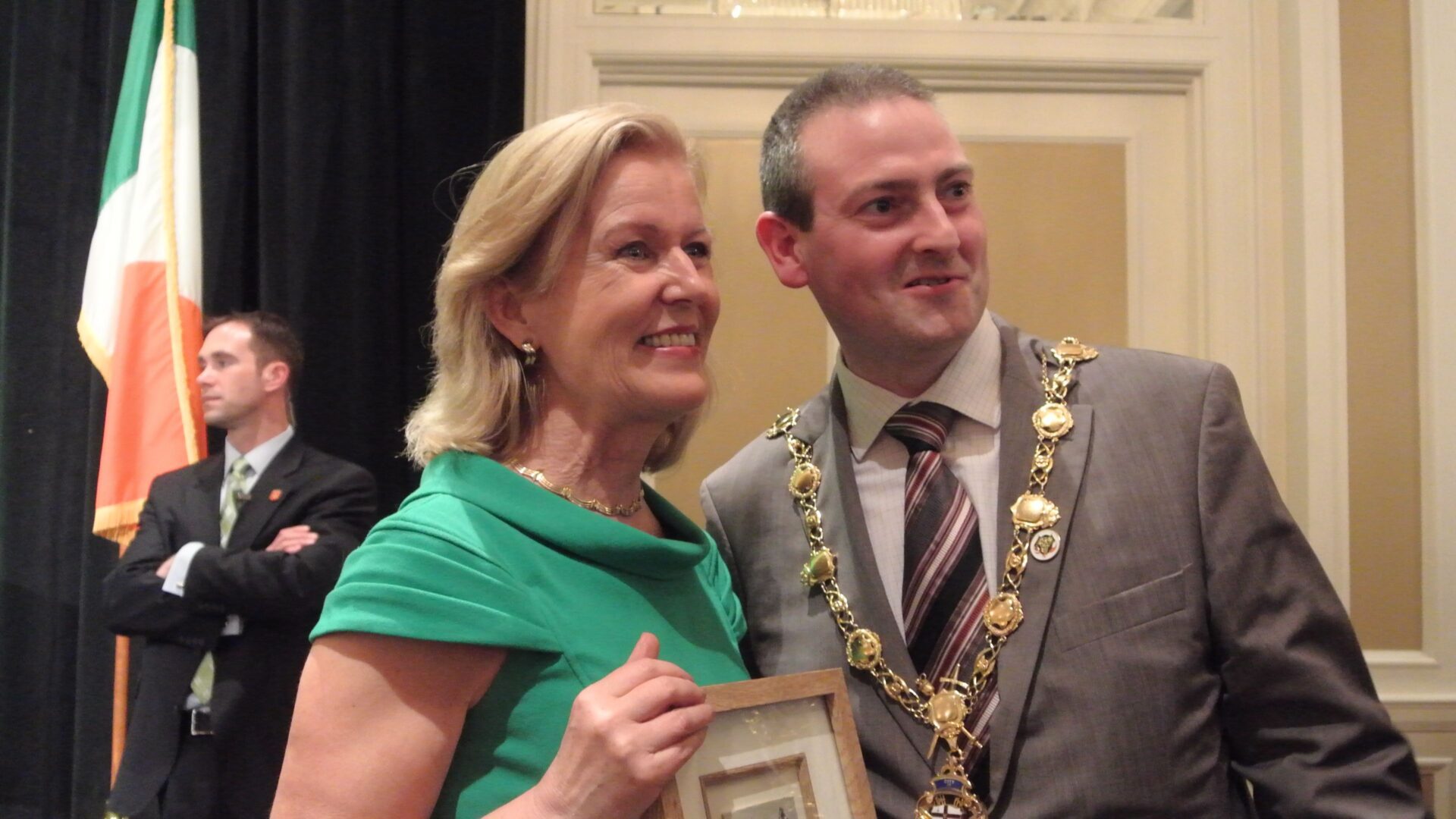 “It’s my job is to introduce An Taoiseach this evening,” said Amb. Anne Anderson, “but of course An Taoiseach needs very little introduction. As you all know, he has been in office three years and over that three years he has presided over an enormous turn around in Ireland and I think there has been a sense from everybody that he has a steady hand on the tiller. These are still trying times, but you know what? Today when I was out there and seeing the sunshine coming through, I thought ‘that’s the attitude of Ireland.’ The sun is coming out, spring is on the way and that’s how we feel back in Ireland. We’ve been through a tough three year winter but the sun is coming out.”