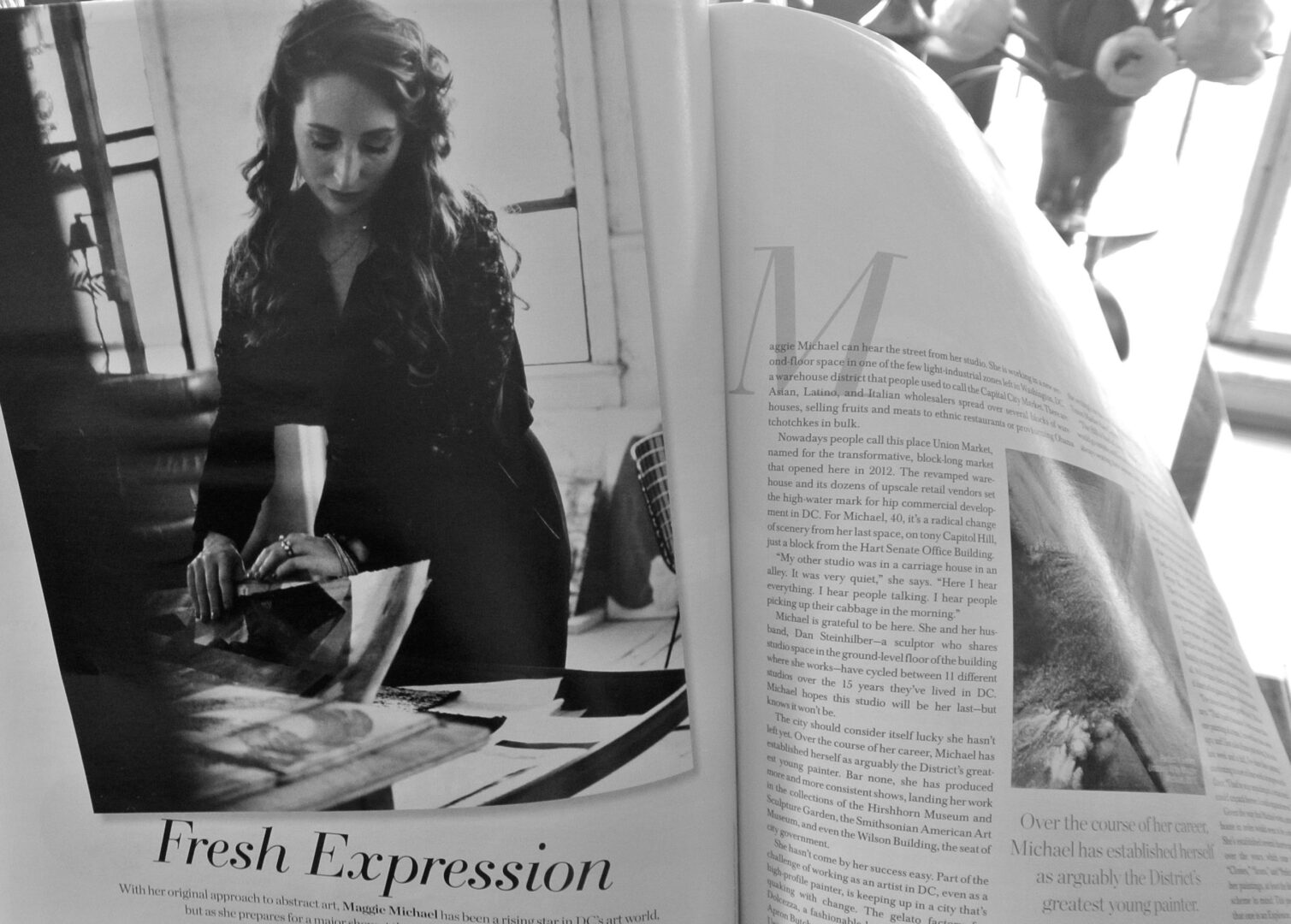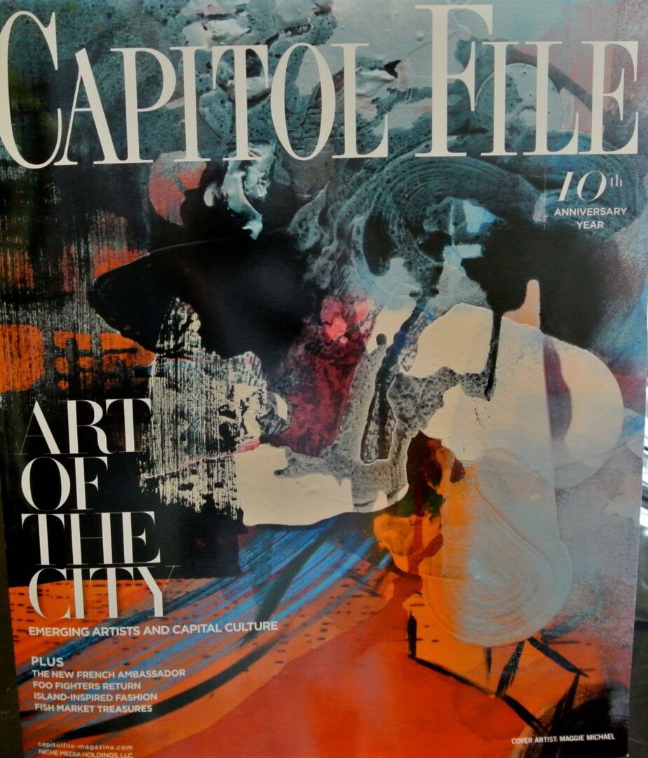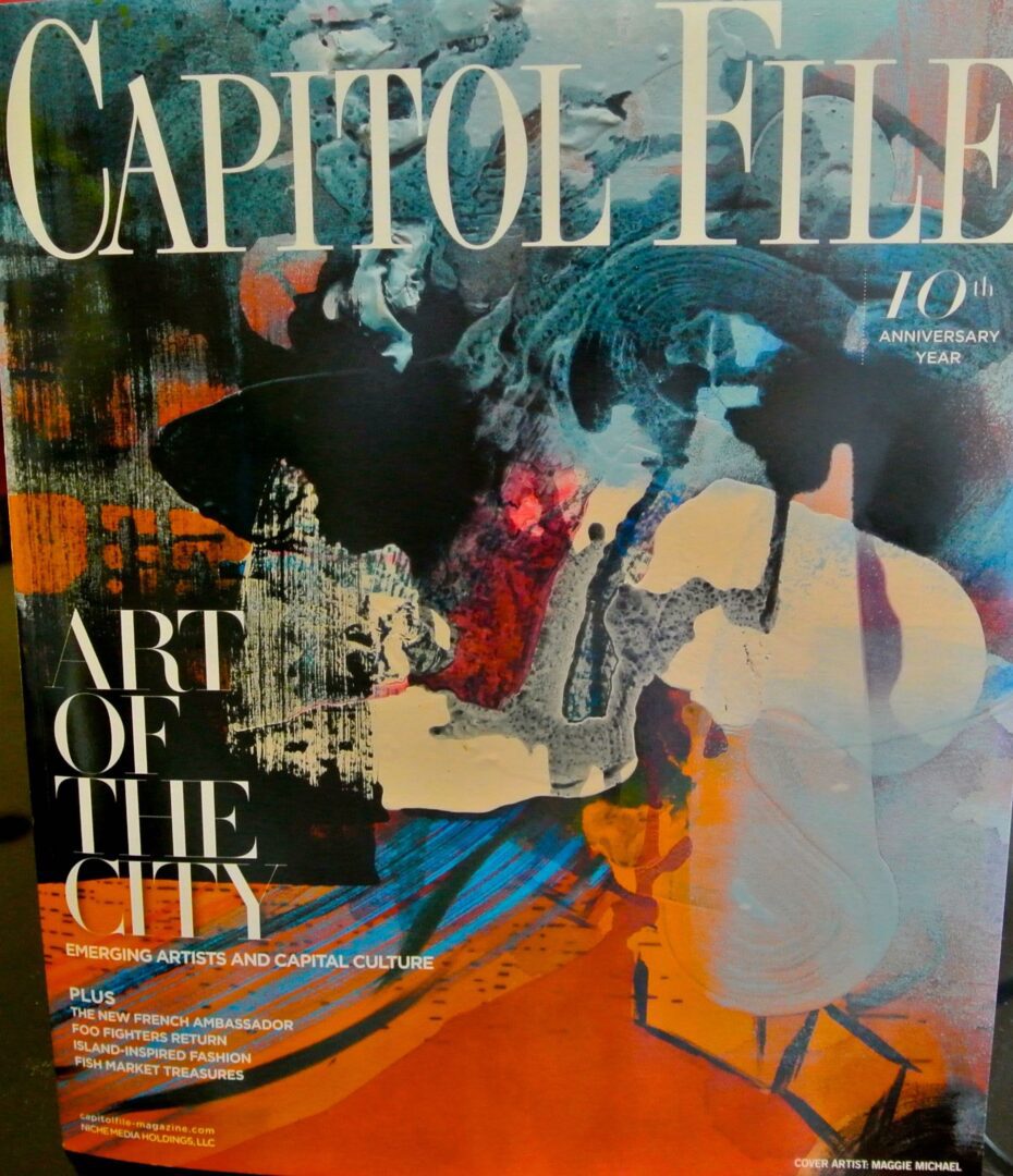 Artist Maggie Michael never planned on being a ‘cover girl’ – that doesn’t happen to artists in a town where socialites, philanthropists and Ambassadors dominate the scene – but such was the case for Capitol File’s 10th Anniversary summer issue that celebrates Art of the City: Emerging Artists and Capital Culture.  “I was very surprised at the invitation to be the cover artist,” Michael told Hollywood on the Potomac prior to a swanky party at the Sofitel Lafayette Square Hotel, a stones throw from the White House. “It wasn’t something I had ever thought would happen to me. They found my e-mail somehow. The editor contacted me probably through a referral, maybe somebody at the Women’s Museum. I was very happy to open that e-mail.”
