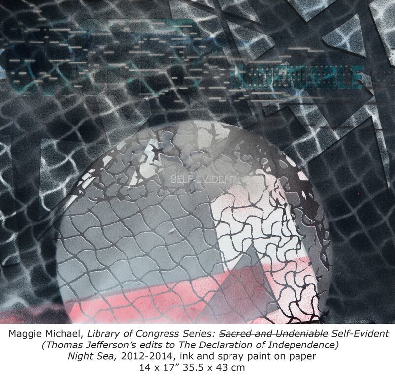 “The work that I have that’s here for the Sitar Arts Center are two prints of a series that I started in, I think in 2011 or 2012, but I continued to work on them up until this year,” Maggie explained to the guests. “I’ll keep working on them until the series is finished. It’s called the “Library of Congress” series and that’s because it was sourced from that place. “That’s where I was inspired to do this work. I went with my son who was probably 10 at the time. It was one of those beautiful Washington spring afternoons and we needed something to do, so naturally, I thought of the Library of Congress. We looked at the Declaration of Independence in which Thomas Jefferson had edited out some words. It was interesting to see what I didn’t know about what his thinking process was. He wrote it as, ‘self-evident that all men and women are created equal.’ I noticed that he crossed out two words; he crossed out “sacred” and he crossed out “undeniable” before he decided to write “self-evident.”  I thought that was so amazing that he could foresee the problem of interpretation. What would it mean if it was “sacred” that all men are created equal? What would it mean if it was “undeniable” that all men are created equal? Those are arguable terms, any lawyer could tell you that, any minister can tell you that, any rabbi can tell you that. The fact that he chose “self-evident” is so powerful for us as a community and as a nation, so that’s the series I chose for the Sitar Arts Center for their auction, for the pieces that will be on auction until August.”