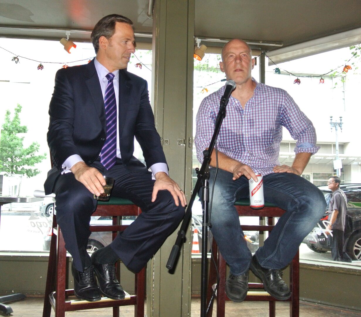 The New York Times best selling authors (Mark Leibovich, This Town and Jake Tapper, The Outpost) came dressed directly from work, noted Leibovich who facetiously pointed that while he arrived in shirt and jeans, the buttoned down Tapper arrived in suit and tie. The two have been both competitors and friends for many years…………..let the fun begin!