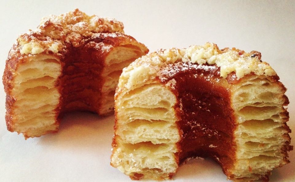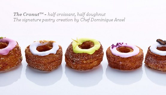 A Cronut is a croissant-doughnut pastry invented by Chef Dominique Ansel and trademarked by Dominique Ansel Bakery in New York City. “There was no magic formula or marketing strategy behind this croissant-doughnut hybrid. It was simply another creation. Glazed on the top, the pastry was filled with cream and sugared like a doughnut, but it had a laminated dough that was similar to-but not the same as-croissant dough. Crispy on the outside, with two layers within, it was a playful treat. Two months and ten recipes later, the Cronut pastry was born.” Dominique Ansel