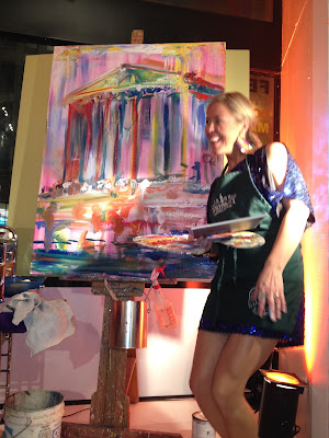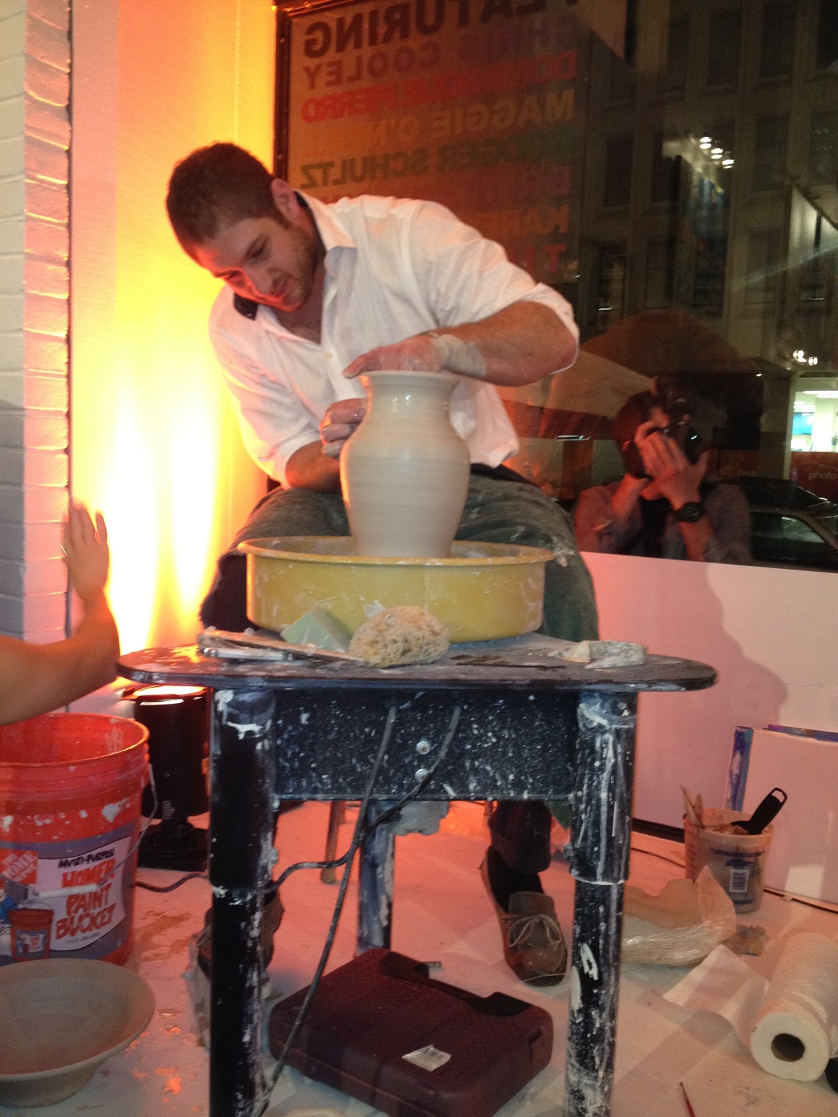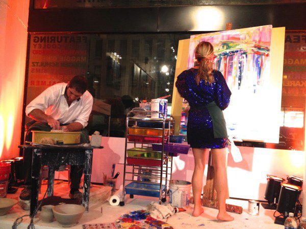 O’Neill, who has been the creative head behind the design of such area gathering places as Lincoln, SAX and Irish Whiskey Public House, brought together over 60 pieces by featured artists, including: Redkins’ Tight End Chris Cooley, photographer Dominique Fierro, Tina Palmer, Rodger Schultz, Brittany Sims, Karen Suderman and designer/artist Maggie O’Neill herself, which festooned the walls, side tables and even the front window, with artists working in full view of a number of curious and interested passers-by—a barefooted O’Neill working on a pop art DC Monument canvas ode, and Cooley fashioning bowls, vases, etc. live at a potter’s wheel—a far cry from the Sunday and occasional Monday night blocking and receiving.