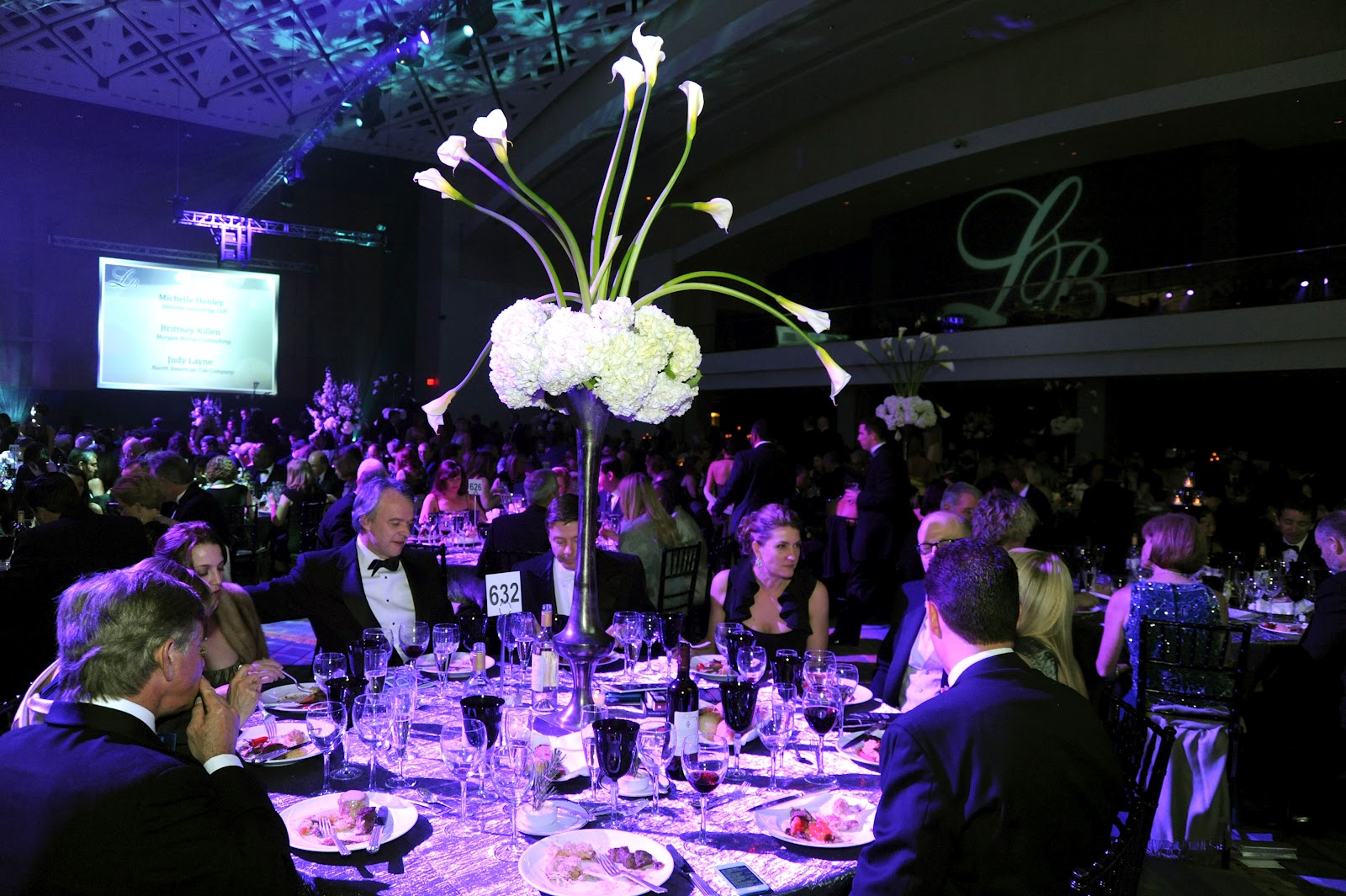 Dazzled guests at the Leukemia Society’s 25th Anniversary Ball entered through a glamorous corridor lined with silken black and white mirror-studded hangings. It was flanked by twelve-foot tall champagne glasses cleverly “built” of strings of lights to match the stemmed glasses of bubbly each arrival was offered from silver trays.