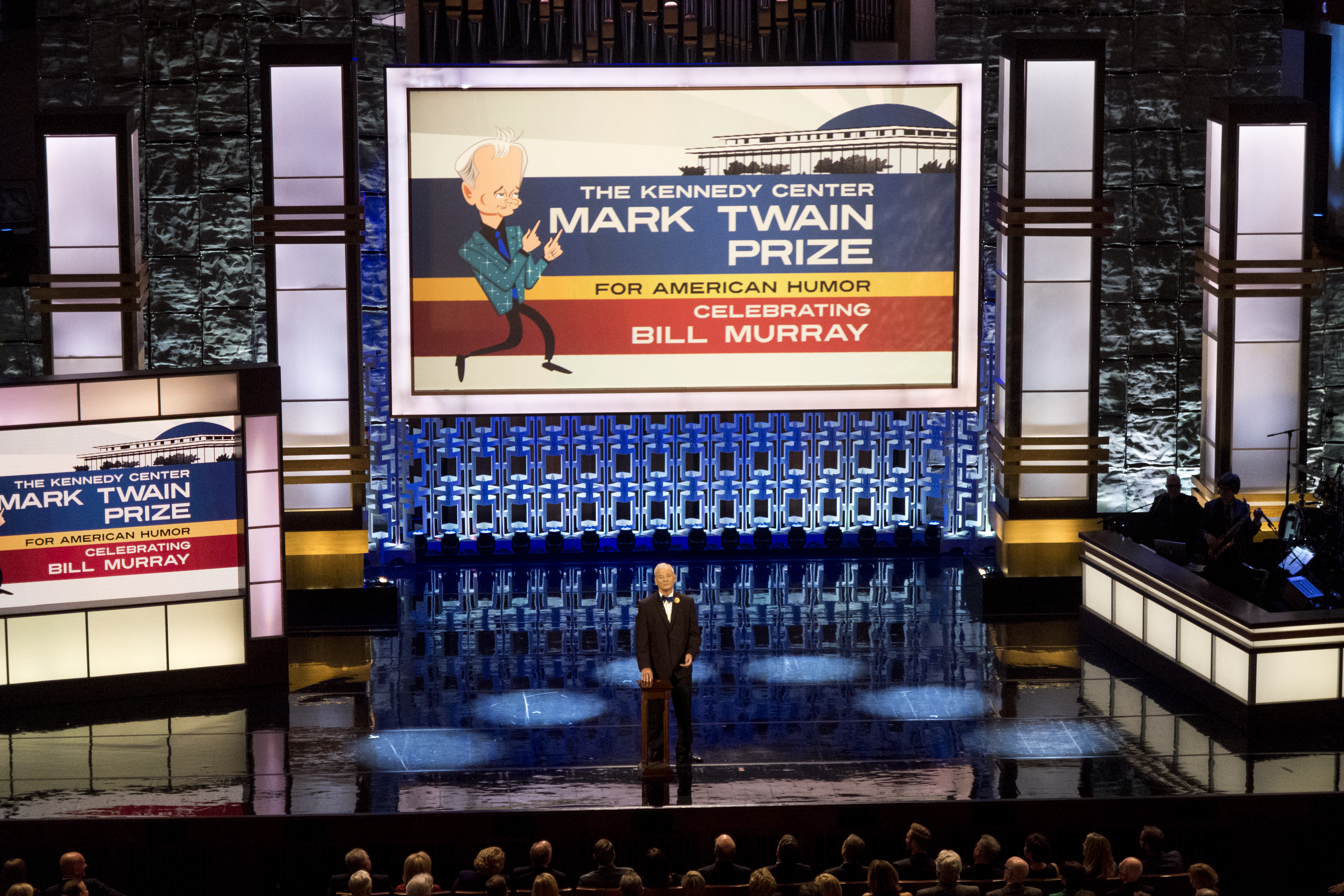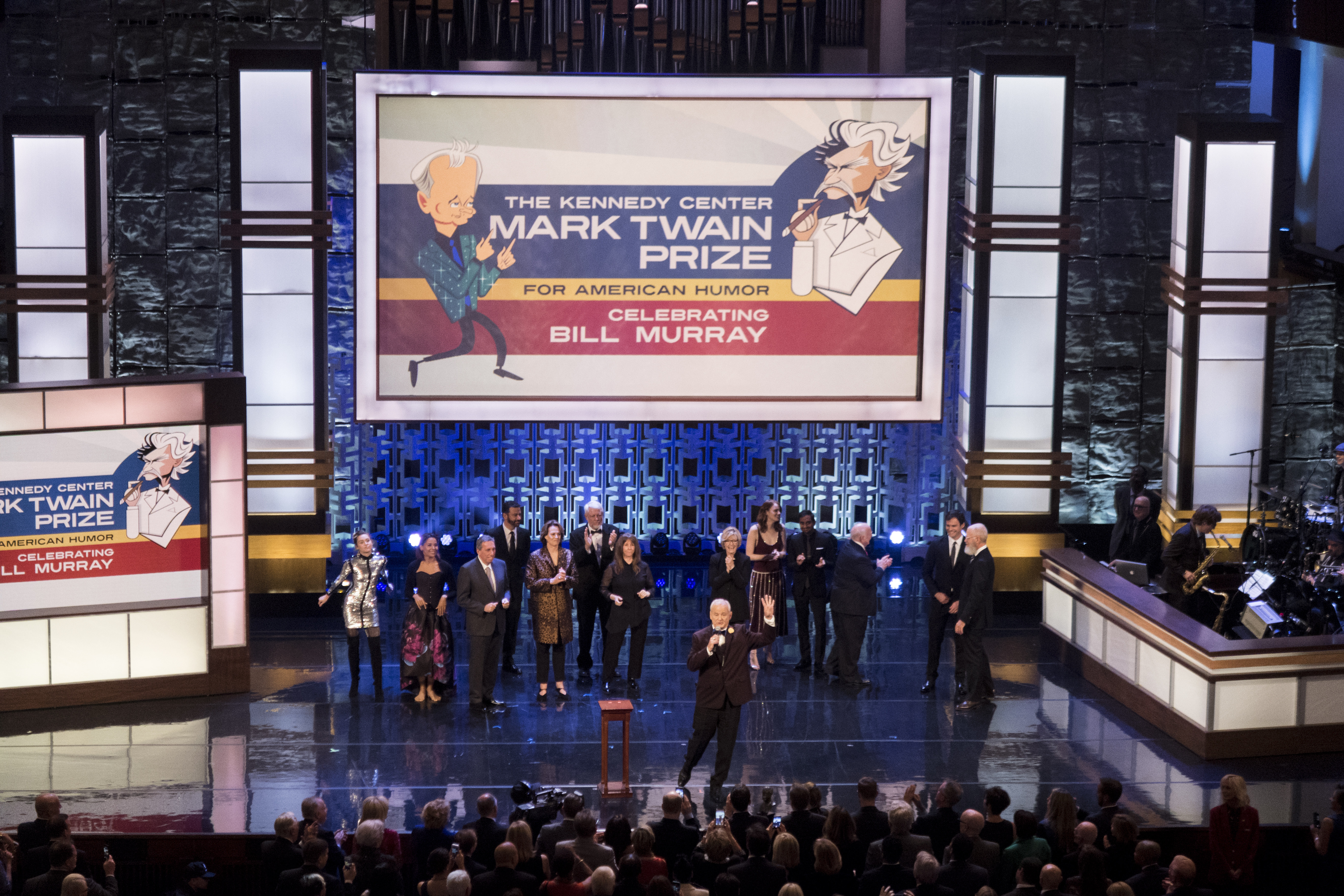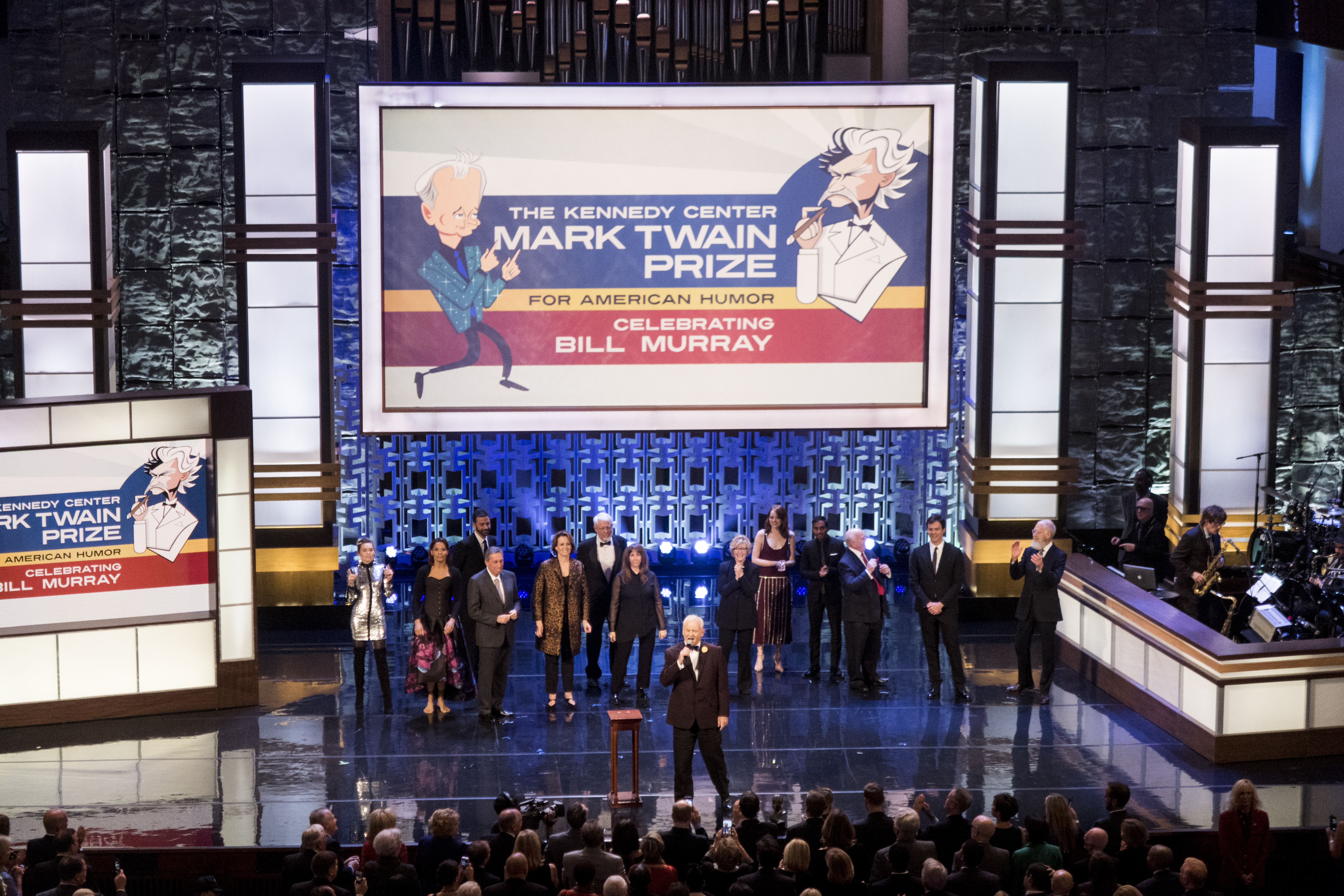 Late night show host Jimmy Kimmel kicked off the evening with his recurring quest to make things awkward by introducing an absentee Bill Cosby. Cosby himself got the Twain Prize in 2009. Kimmel called Bill Murray “the Irish El Chapo” because he’s so hard to locate and described his penchant for randomness as a blessing because some people “live in the moment, and he actually does that.”