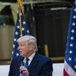 “I think we have a very different style,” said Trump of Hillary Clinton. His business claws are out as he stands in a building that will feature his name and notes that Clinton can’t touch him when it comes to trade policy. “The money that is being drained out of our country is enormous and that’s not her thing. That’s totally my thing.” The anxious pack of reporters wanted to push-and-pull on foreign affairs after the morning announcement of international policy advisers and the upcoming address in the day at AIPAC, but Trump’s CEO hat was squarely on and this was one room where he would not be bullied, even taking the opportunity to charm the crowd by inviting a young veteran to join him at the podium who was asking about jobs and offering her a job based on “instinct.”