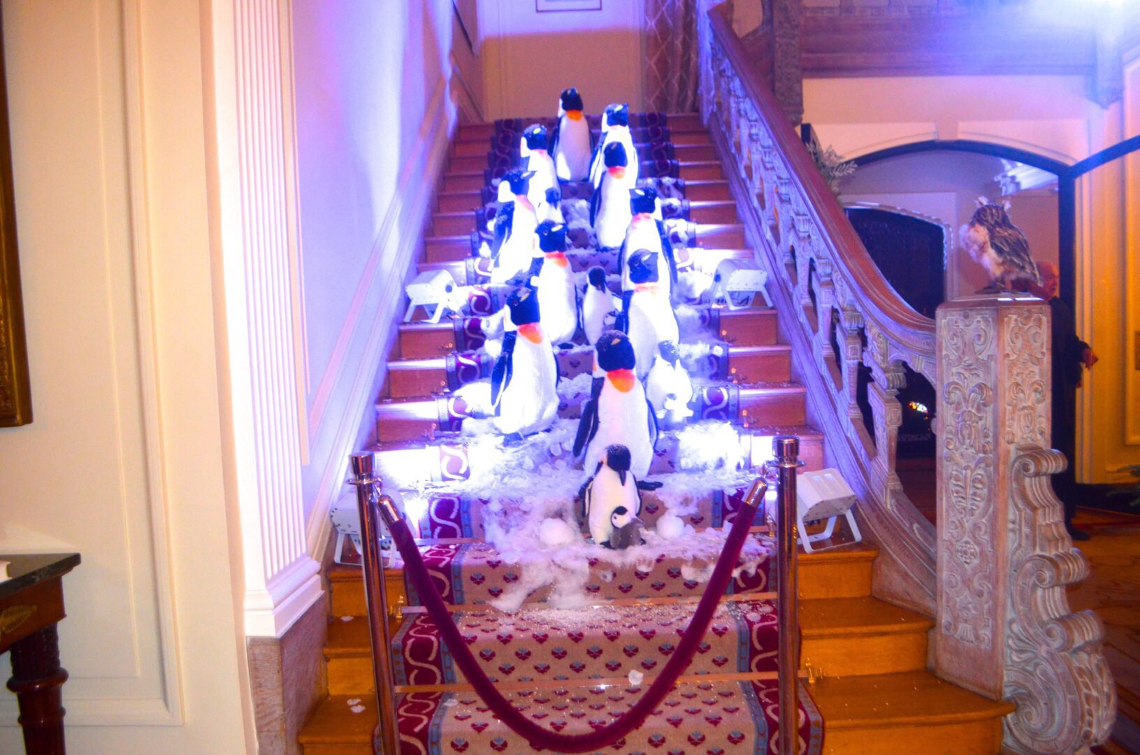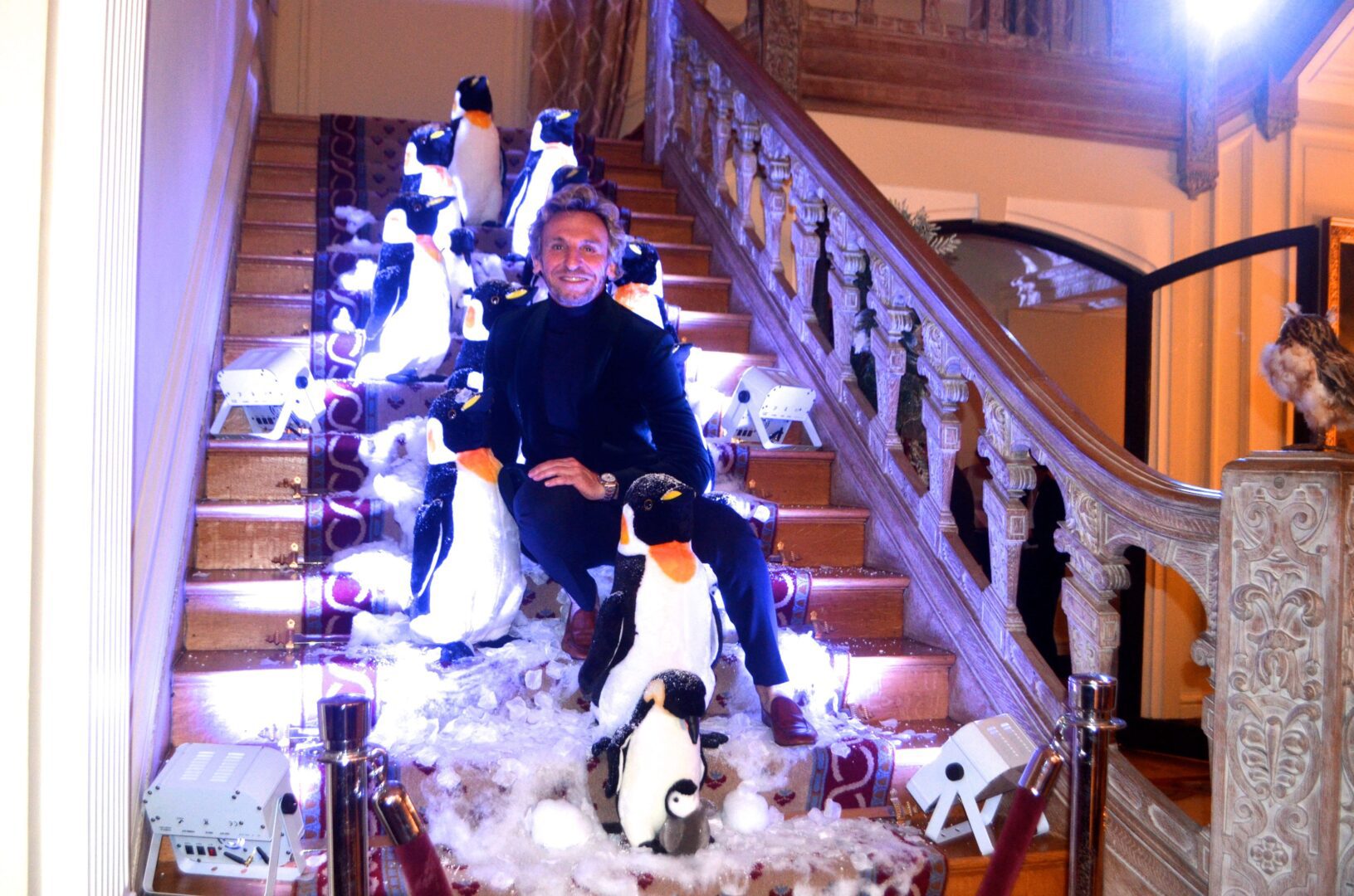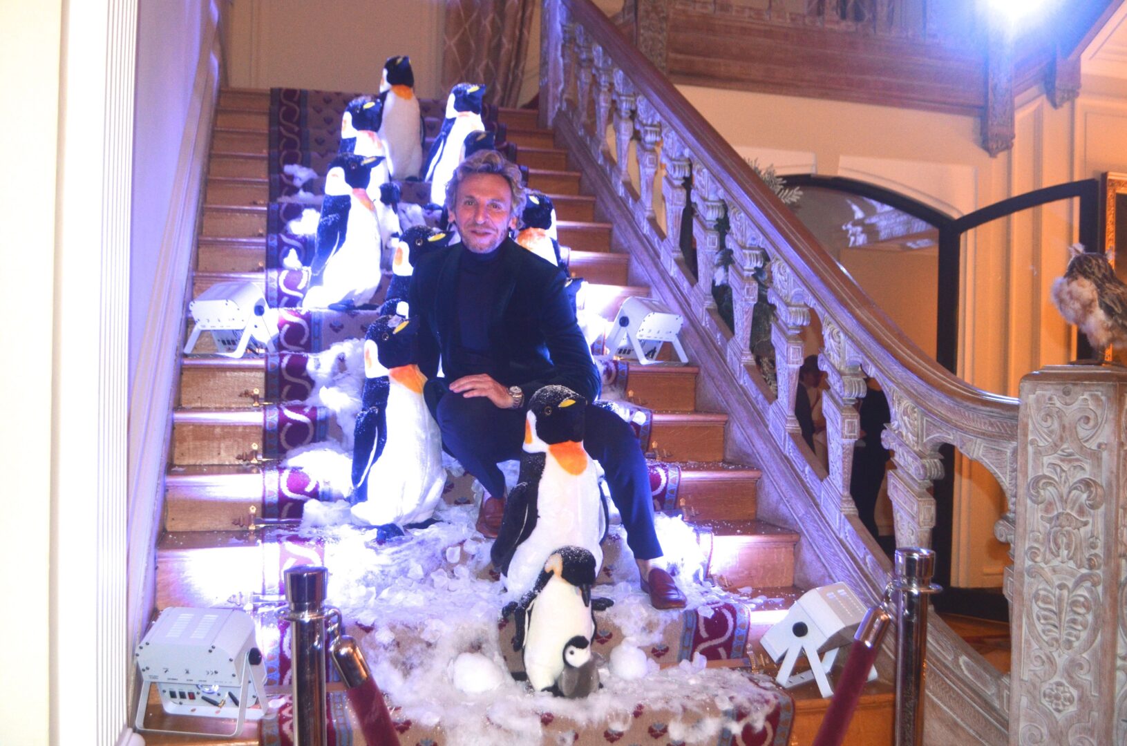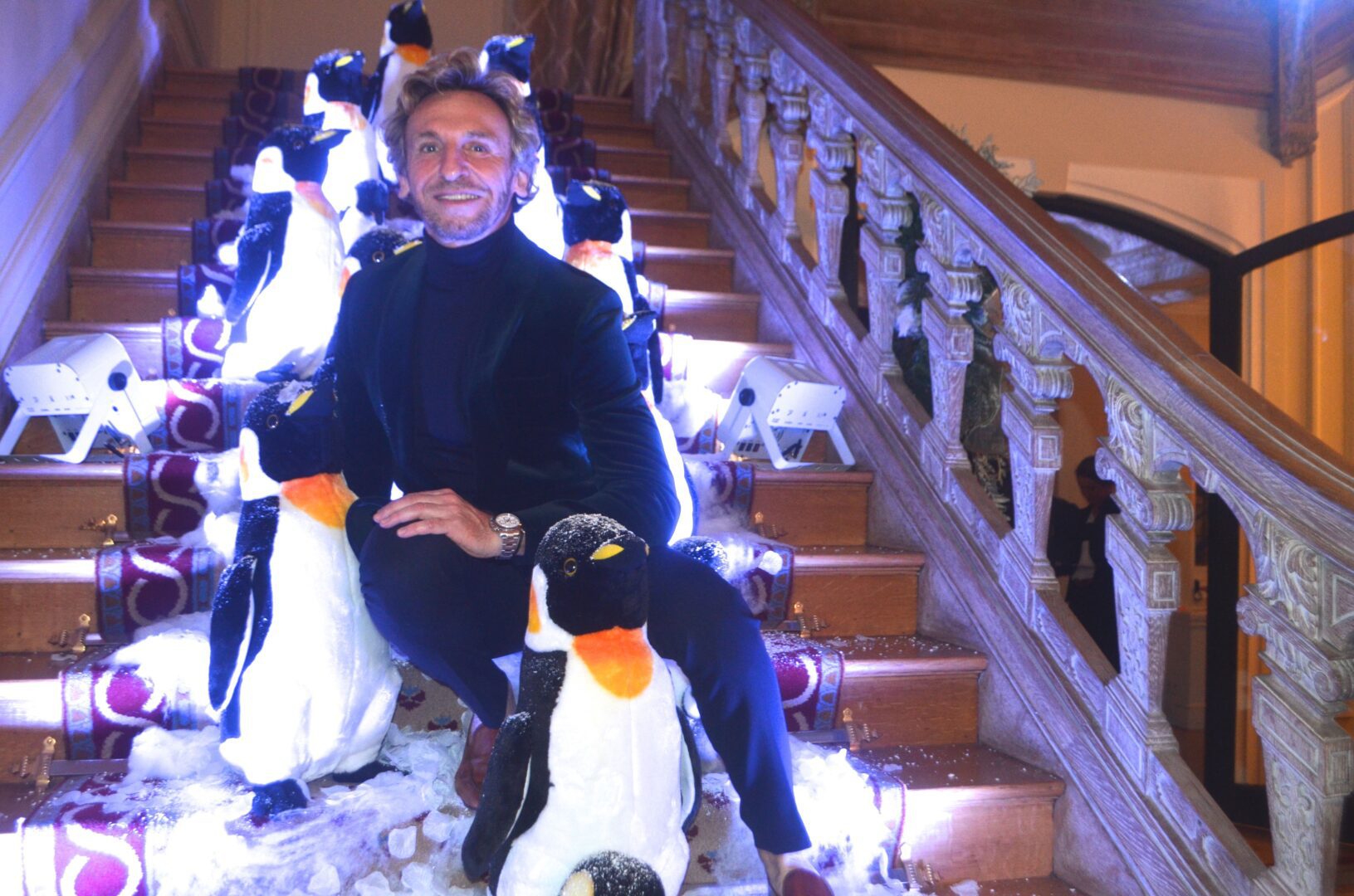 We’re not sure why a flock of Penguins ended up on the staircase at the residence of Gérard Araud, The Ambassador of France, since Penguins – unlike most humans – enjoy sub-zero temperatures and today’s Polar Vortex with air and wind chills that dipped to Siberian levels is paradise for these fabulous creatures. “I did this decor because I wanted to tell a short story about climate change,” artist-photographer Pascal Blondeau told Hollywood on the Potomac. “The first victims of our beautiful planet are Bears & Penguins. I wanted to tell how Ambassador Araud and myself  take climate change seriously. I did this kind of work many times when I was a [sceneographer] at the Museum of Decorative art in Paris.”