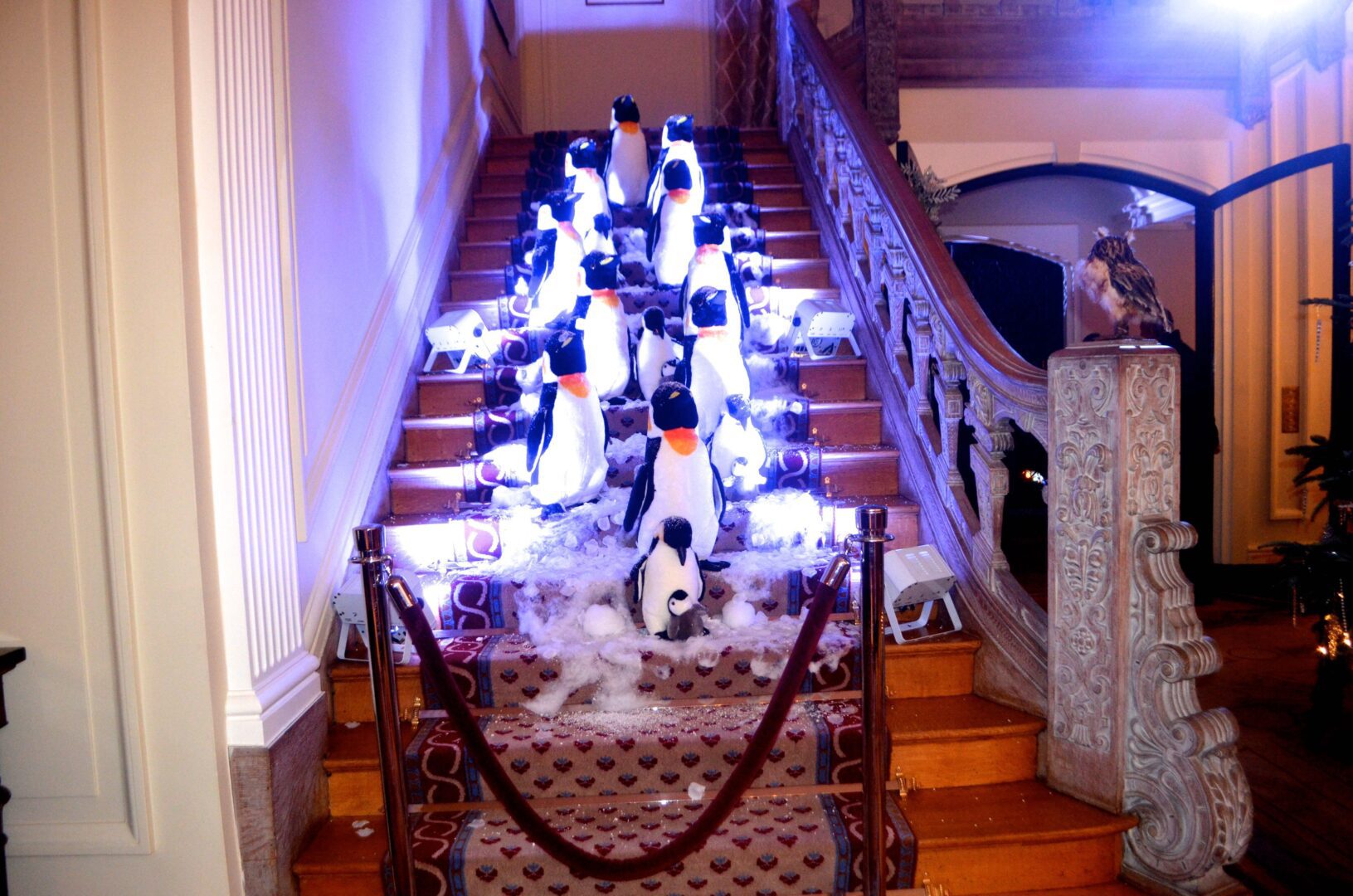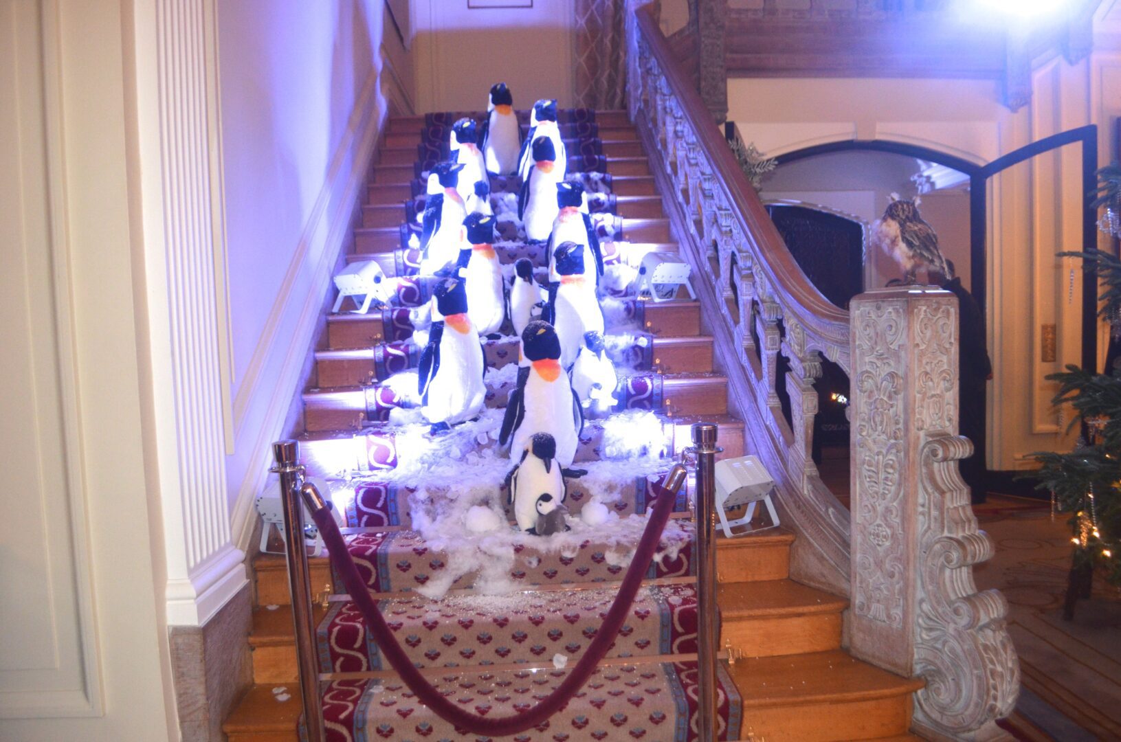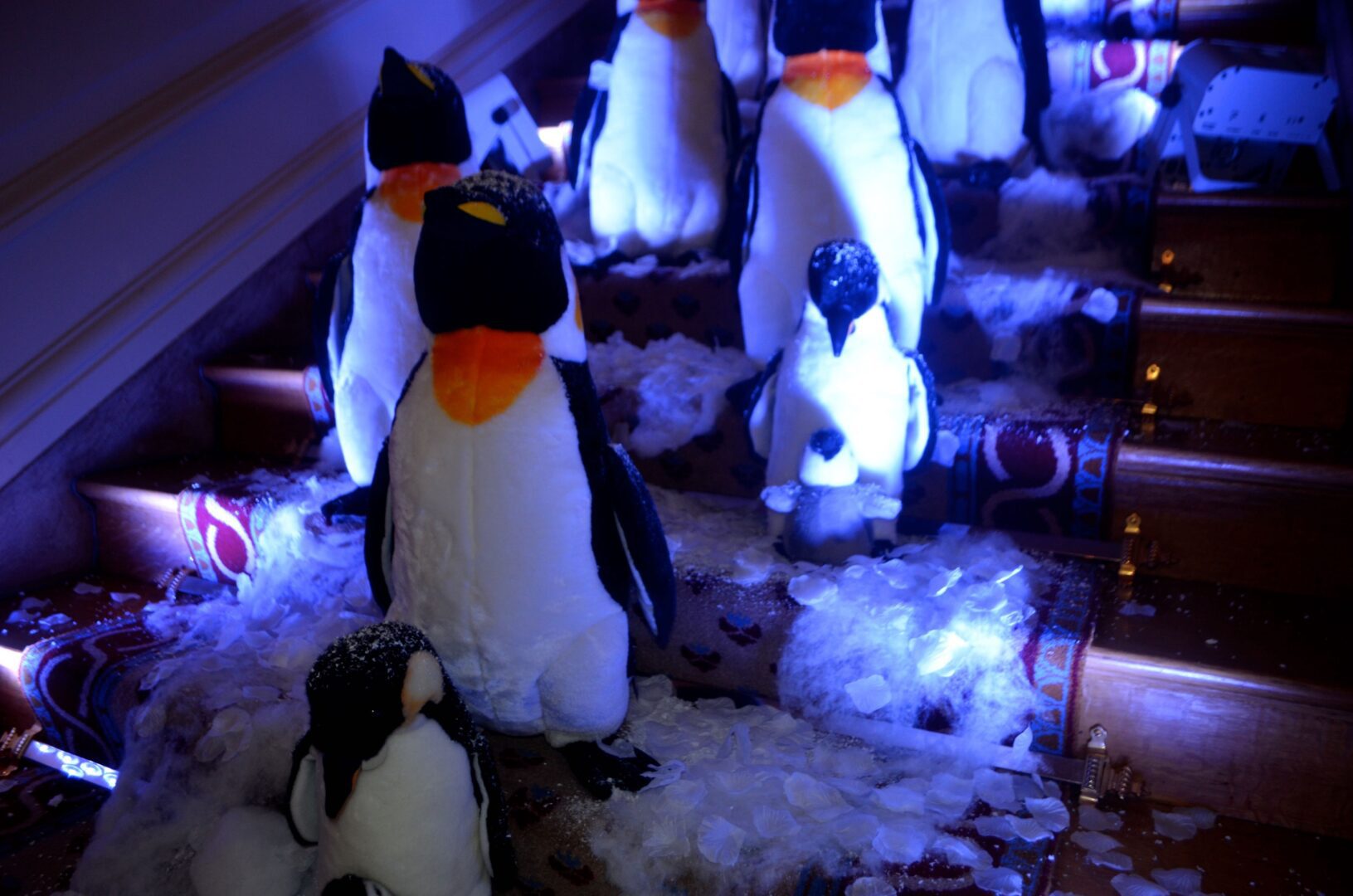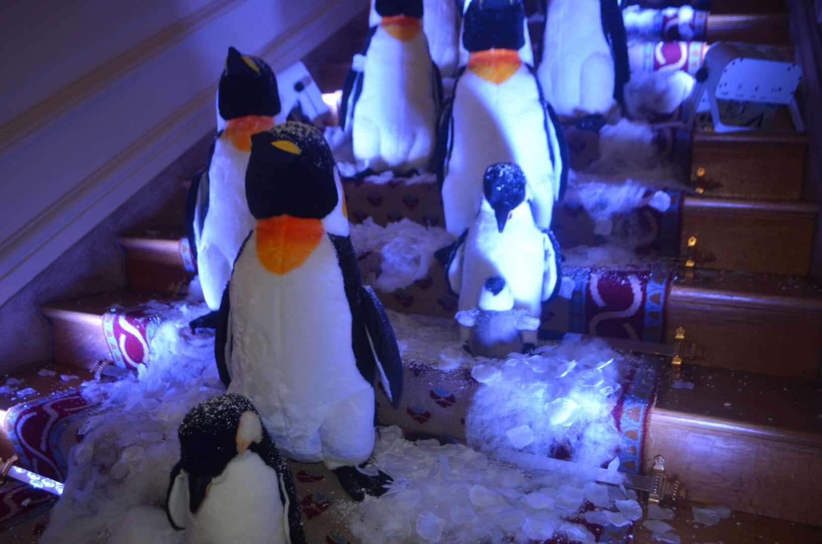 We’re not sure why a flock of Penguins ended up on the staircase at the residence of Gérard Araud, The Ambassador of France, since Penguins – unlike most humans – enjoy sub-zero temperatures and today’s Polar Vortex with air and wind chills that dipped to Siberian levels is paradise for these fabulous creatures. “I did this decor because I wanted to tell a short story about climate change,” artist-photographer Pascal Blondeau told Hollywood on the Potomac. “The first victims of our beautiful planet are Bears & Penguins. I wanted to tell how Ambassador Araud and myself  take climate change seriously. I did this kind of work many times when I was a [sceneographer] at the Museum of Decorative art in Paris.”