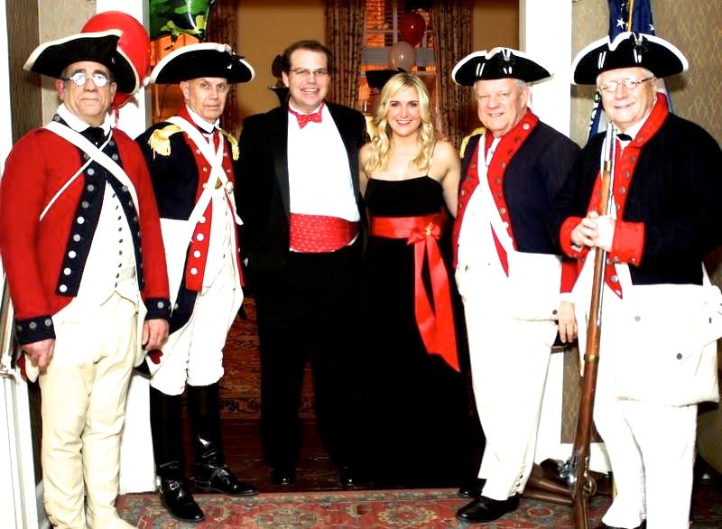 Tripp DeMoss and Kate Henvey flanked by Revolutionary War actors David Embrey, Pete Davenport, Larry McKinley, and Vernon Eubanks