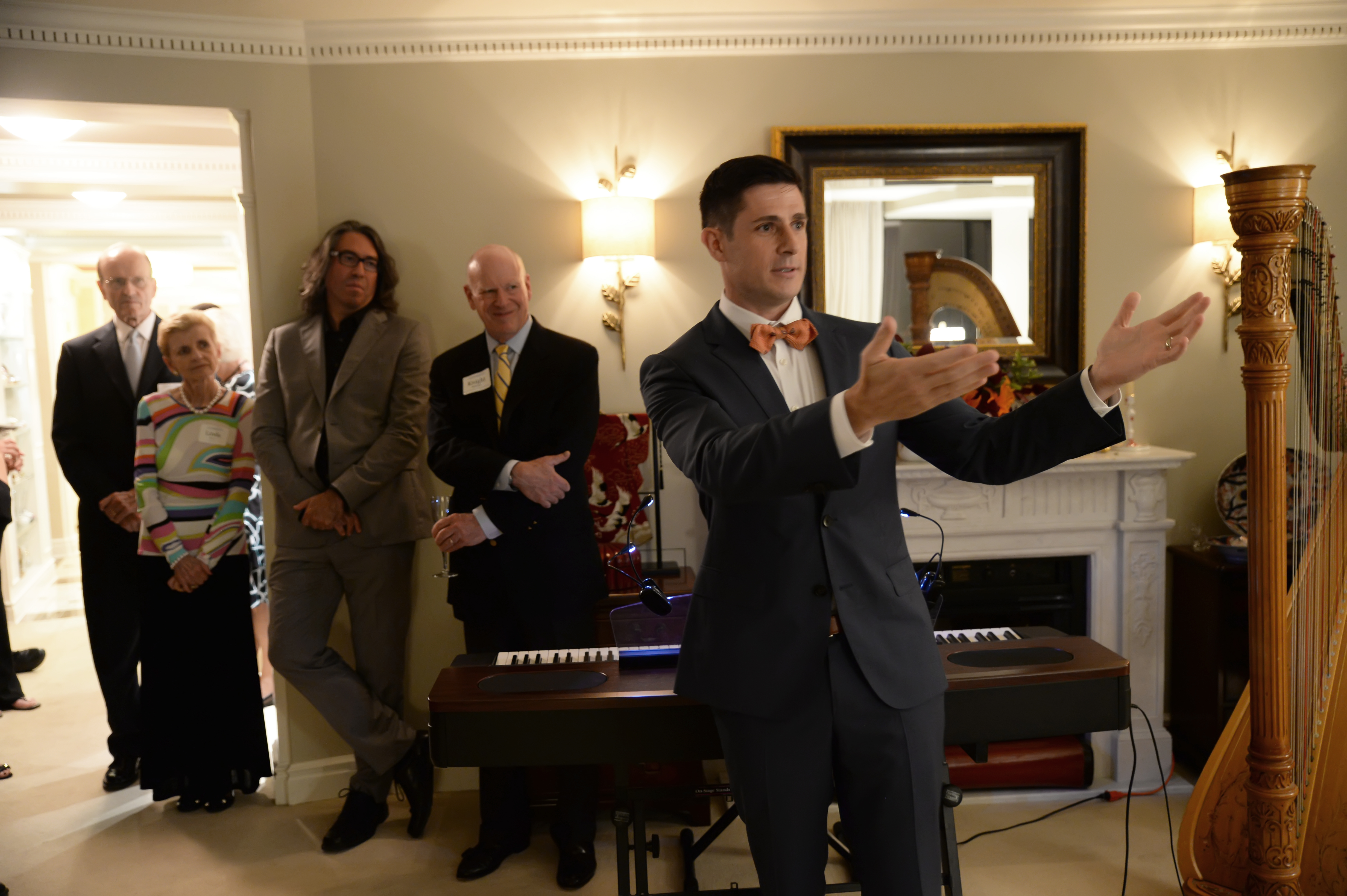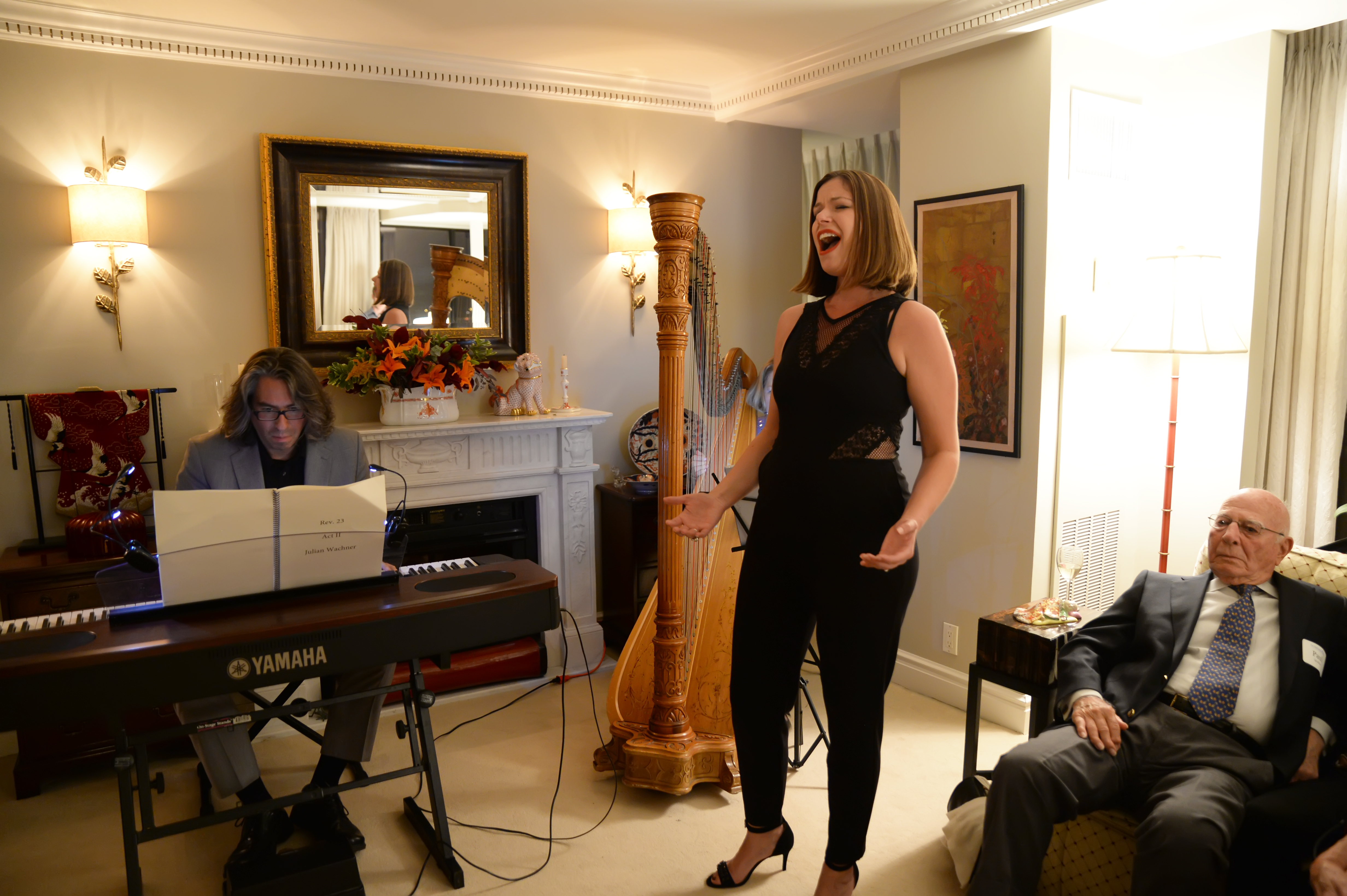 “This is incredible work,” said Music Director Julian Wachner who introduced the talent and took to the piano himself for a Cliff Notes version of Philip Glass’s fifth symphony. “Phillip Glass is turning 80 next year. He was born in 1937 and for those of us, now that I’m on the other side of 45 I can say this, those of us who are a little bit older can remember when Phillip Glass was sort of doing this weird thing called minimalism and it’s interesting for me to see that there’s a whole generation of composers that look to Phillip Glass as their leader – composers like Nico Muhly, Missy Mazzoli, David Little – the people that you’re reading about now who are in their 20s and 30s, so something has happened where Phillip Glass has become an icon. We’re really super excited to present this mammoth work of his this fall. We thought we would give a little bit of a sampling of his music with one of these metamorphosis for harp. It’s actually originally for piano. If any of you have seen the movie The Hours, Phillip Glass did the soundtrack for that work and for many many movies that we’ve all seen. This is a 2-minute version and there’s something that seems counter intuitive to have a two minute version of Phillip Glass anything; his usually last eight or nine hours.”