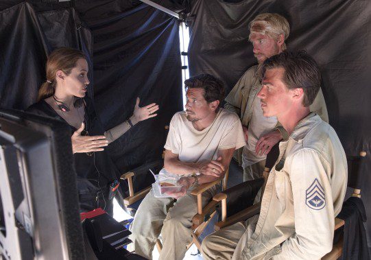 (L to R) Director ANGELINA JOLIE works with JACK O’CONNELL as Louis “Louie” Zamperini, DOMHNALL GLEESON as Russell Allen “Phil” Phillips and FINN WITROCK as Francis “Mac” McNamara on the set of “Unbroken”, an epic drama that follows the incredible life of Olympian and war hero Zamperini who survived in a raft for 47 days after a near-fatal plane crash in WWII—only to be caught by the Japanese Navy and sent to a prisoner-of-war camp.